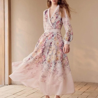 Diana Maxi Dress - Shawl Collar - Bishop Sleeve - High Waist - A Line - Floral Print
